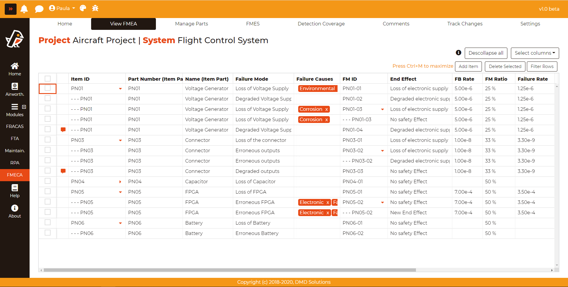 The user can directly delete an entire item by right-clicking on the specific item cell on the table. The same procedure can be used to delete a Failure Mode.
