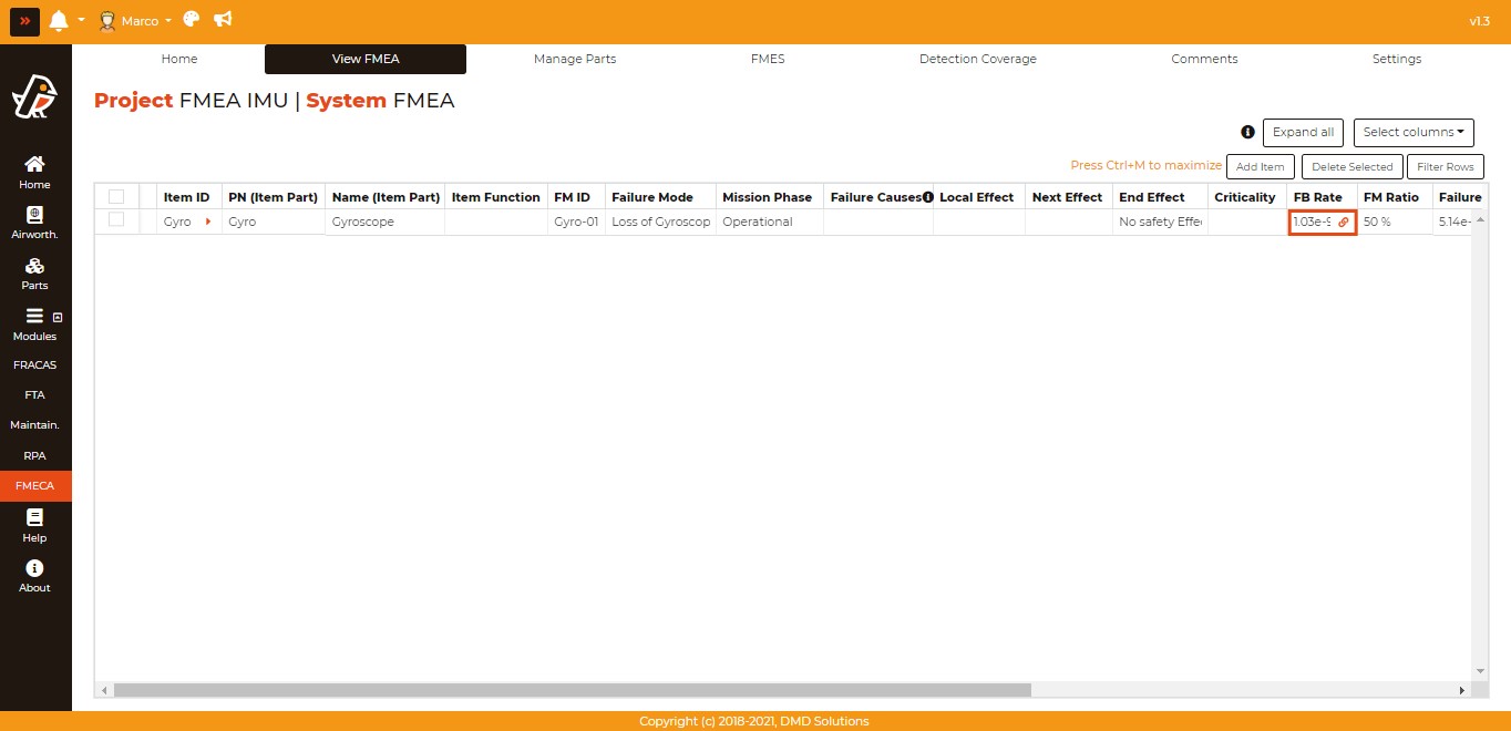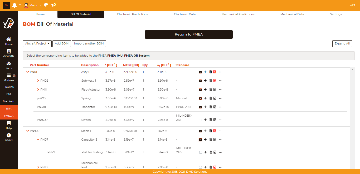 This will allow access to the linked project’s Bill of Materials, which is useful to synchronize specific items’ FB Rates within FMEA. To add these items, go to the “Manage Parts” tab in FMEA and under “Item List”, click on the “Select Parts from RPA BOM” button. From here, you select which parts you would like to synchronize with FMEA and then click the “Return to FMEA” button (see below).