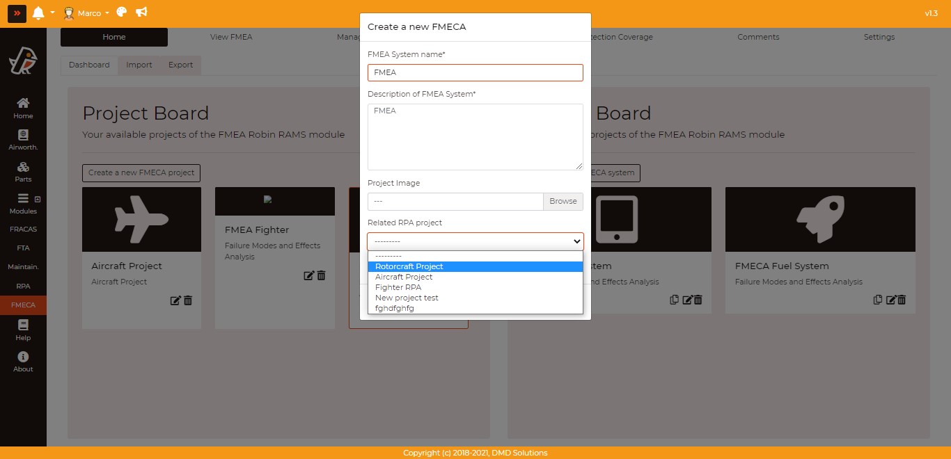 When creating an FMEA system within a project, there is the option to link it to an RPA project, as seen in the modal below. To do so, click on the dropdown labeled “Related RPA project”.