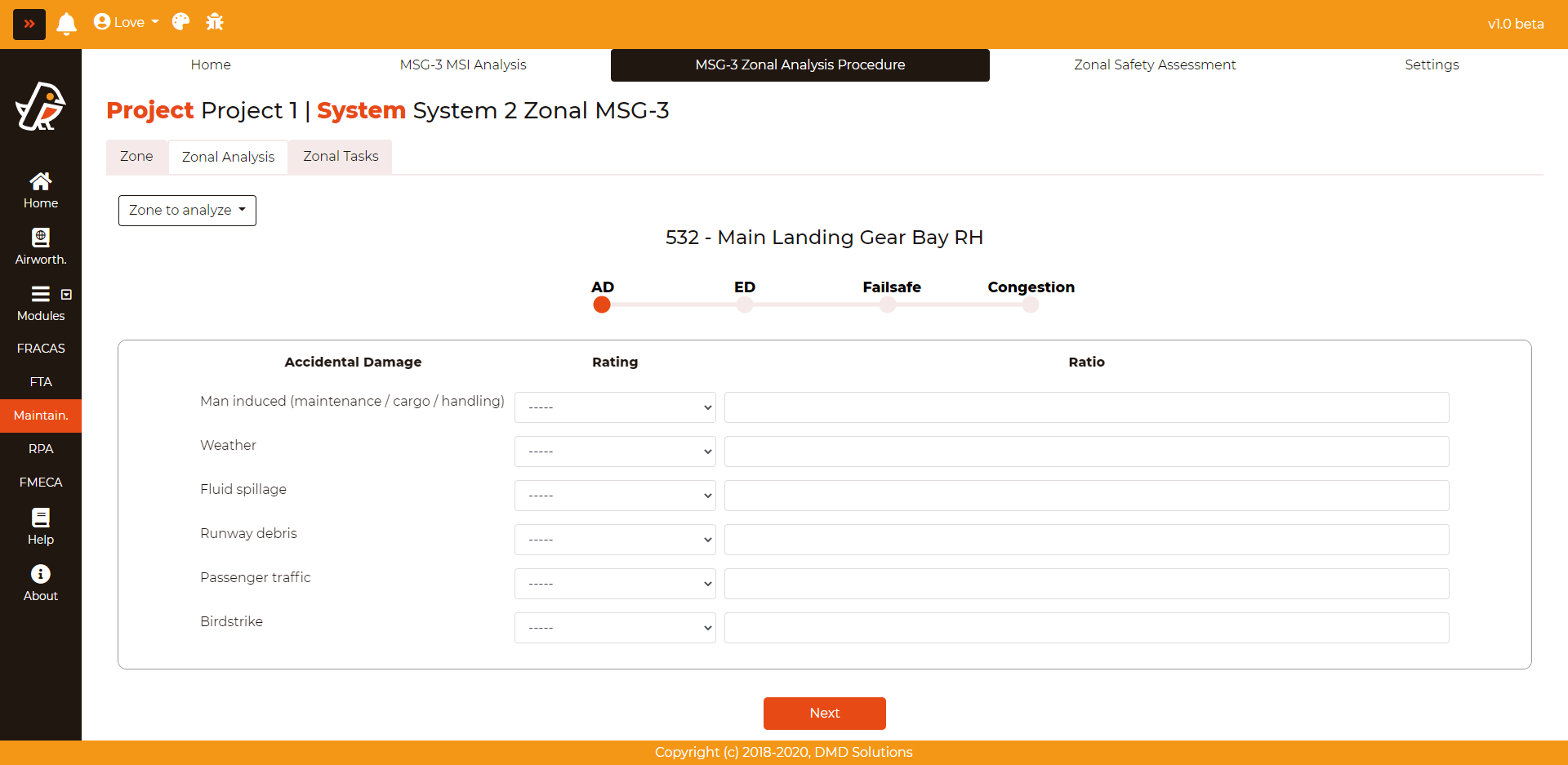 To perform the zonal analysis, go to Maintainability > MSG-3 Zonal Analysis > Zonal Analysis. For each zone, four different analysis are required. After choosing a zone, the user will have to fill four different forms: