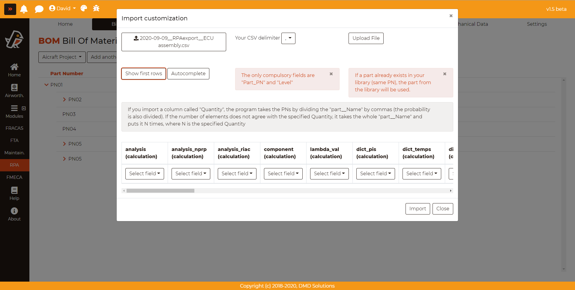 The import can be done directly on the BOM by clicking on the “Import parts” icon or by clicking on “Import another BOM”. The appearance of the format is similar to all the imports of Robin. The user can link the columns from the CSV file to the columns of the database.
